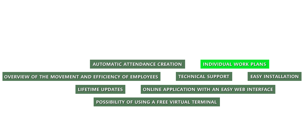 User identification is done via attendance terminals and sensors. Access is done through fingerprint, chip card or entering a PIN code. Most of the readers connect entry (record) with a photo, which in addition to re-verifying of access also helps to create a variety of reports.